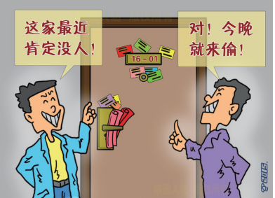 二、家中所有成员,都要养成自觉保护私人信息的良好习惯,不要为了满足虚荣心而经常对无关人员炫耀财富。每天出门和睡觉前,都要仔细检查门窗是否关严、锁好。对经常被人偷偷贴在门上、插入门缝的各种广告、传单、名片,要及时清理,以防让人觉得家里经常没人居住。