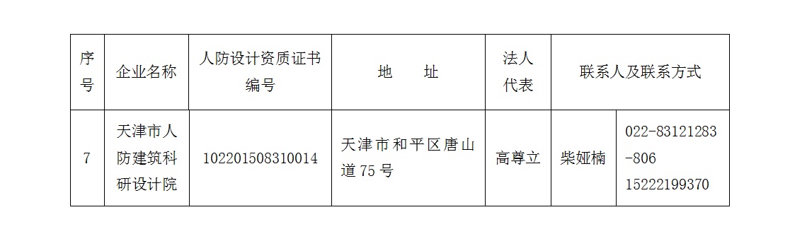 根据国家人民防空办公室《关于印发<工程设计行政许可资质管理办法>的通知》(国人防〔2013〕417号)、《印发<社会中介机构承担人民防空综合防护体系建设任务管理规定(暂行)>的通知》(国人防[2012]23号),经我办核实,天津市人防建筑科研设计院具有人防工程设计甲级资质,证书编号:109201508310007。现已在我办进行备案,可在我省行政区域内从事各类人防工程设计业务。